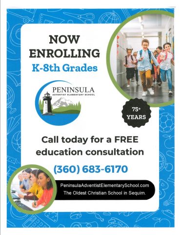 Peninsula Adventist Elementary School is enrolling for 2025-2026 school year. Call for an appointment to take a tour of the campus, meet the teachers, check out the curriculum, learn about the music program, and other programs the school has to offer. Head Teacher, Josh Bonifant can be reached at 360-683-6170.